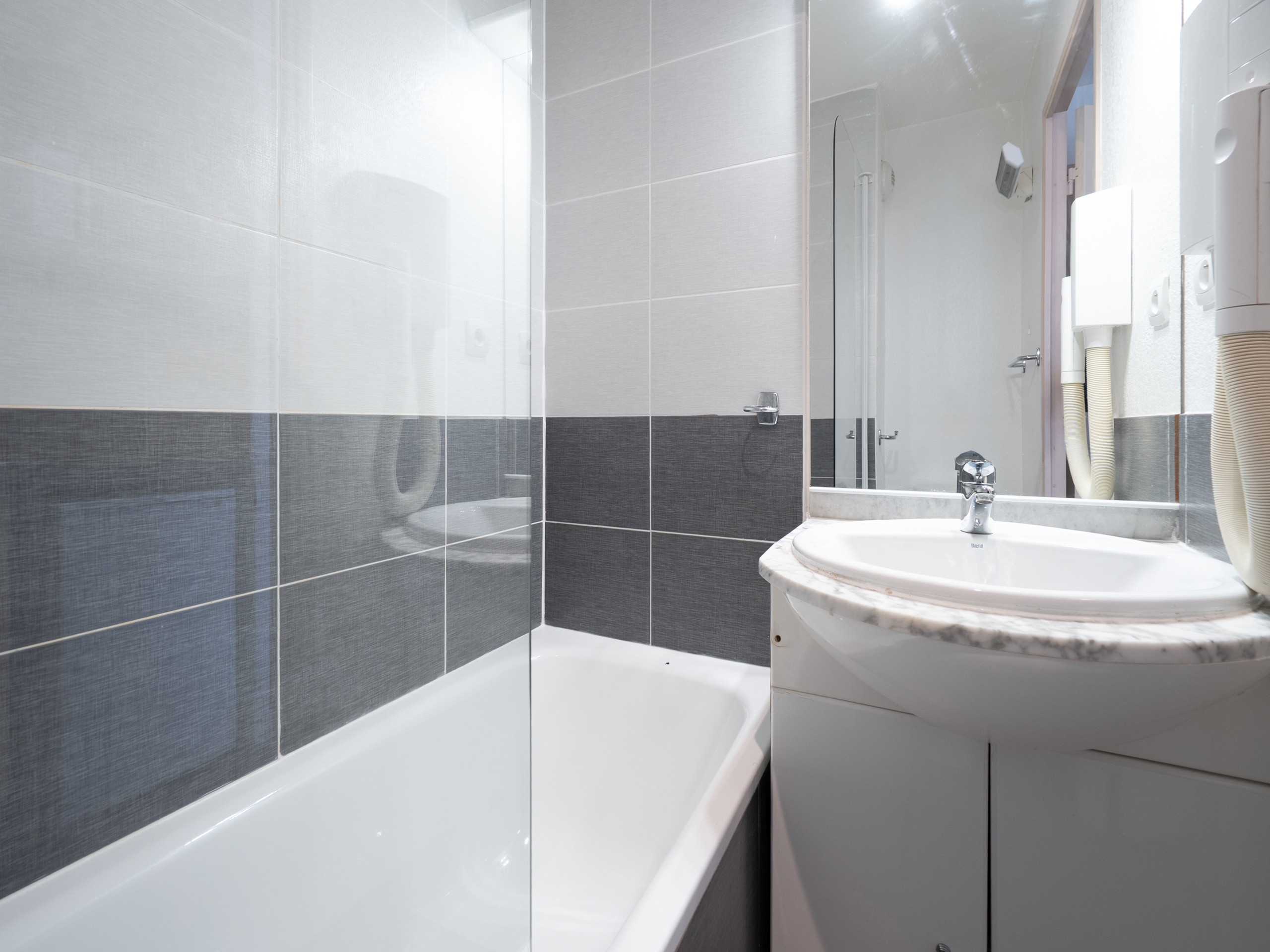 - Bathroom: Bathtub with toilet in the bathroom, hairdryer.