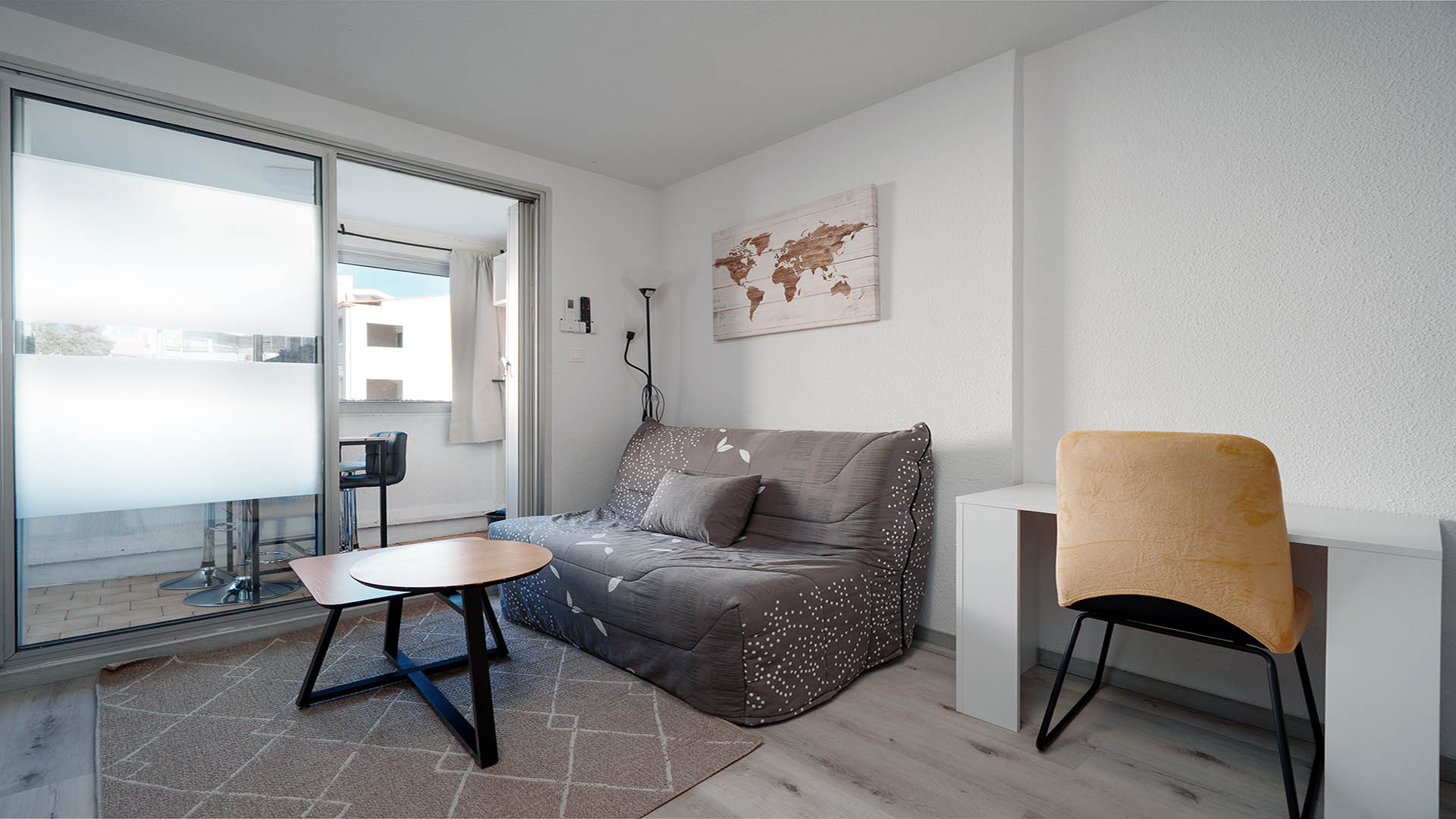 - Loggia avec espace cocooning, canapé et table basse