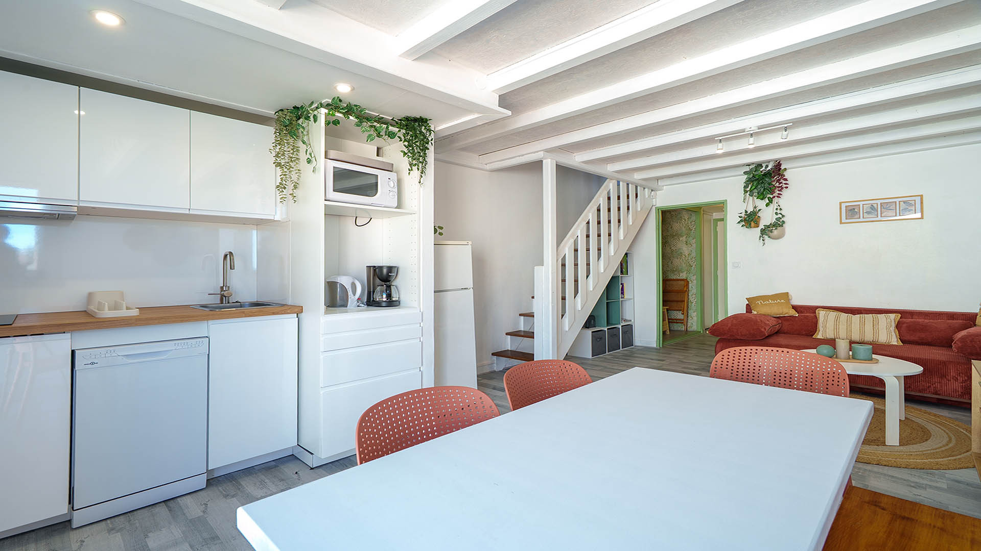 - Cuisine totalement équipée (réfrigérateur, congélateur, micro-ondes, cafetière à filtres, lave-vaisselle, bouilloire, vaisselle/couverts et ustensiles de cuisine);