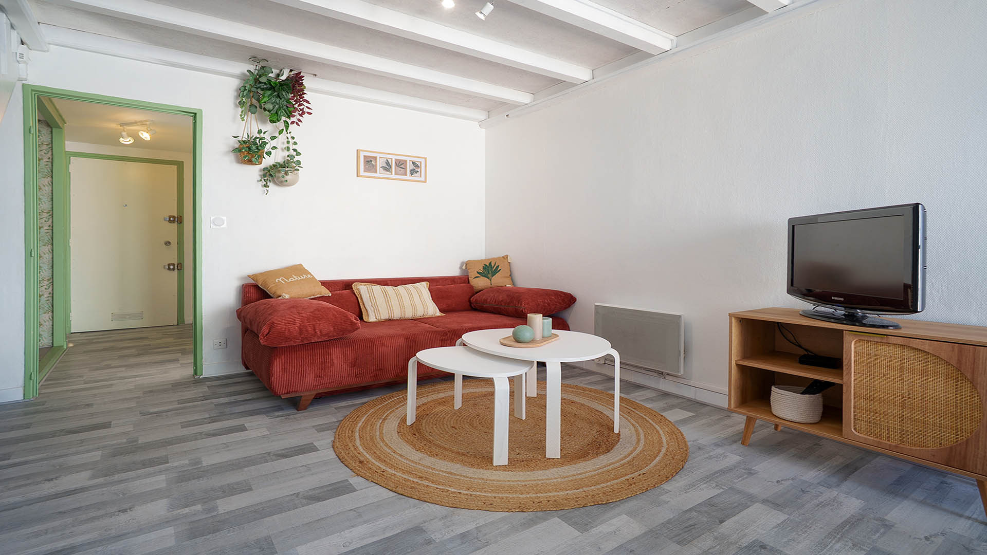 Séjour : 1 canapé-lit confortable, une télévision pour vos soirées détente.