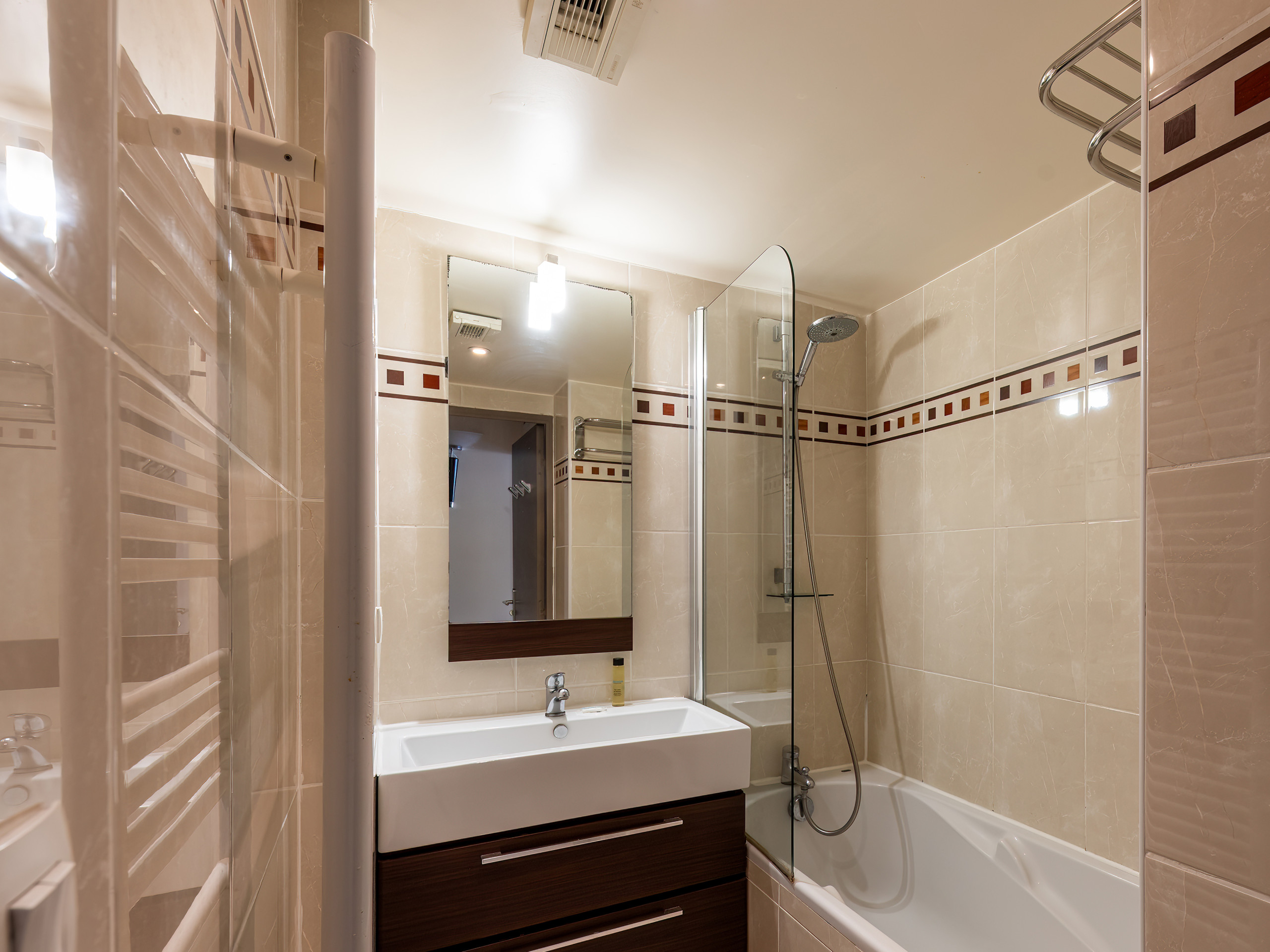 Salle de bain : combo baignoire ET douche, porte-serviette, sèche-cheveux et sèche-serviette