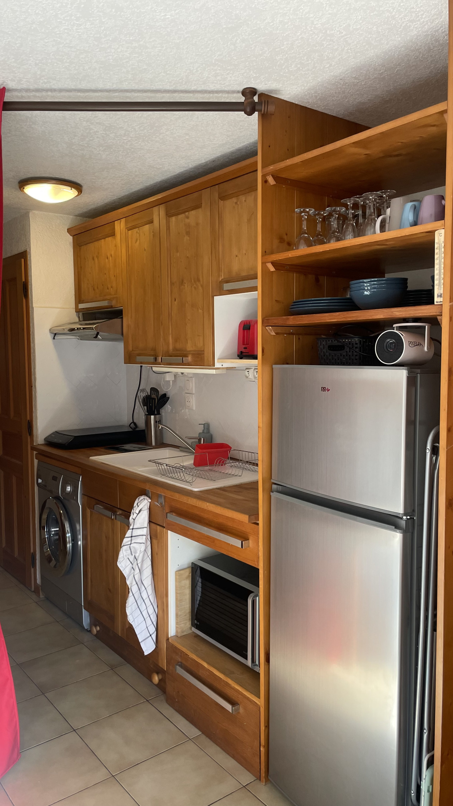 Cuisine : réfrigérateur, micro-ondes/grill, vaisselle, couverts, ustensiles de cuisine, cafetière Nespresso à capsules, grille-pain, bouilloire, appareil à raclette, appareil à fondue… bref, tout pour survivre et se régaler !