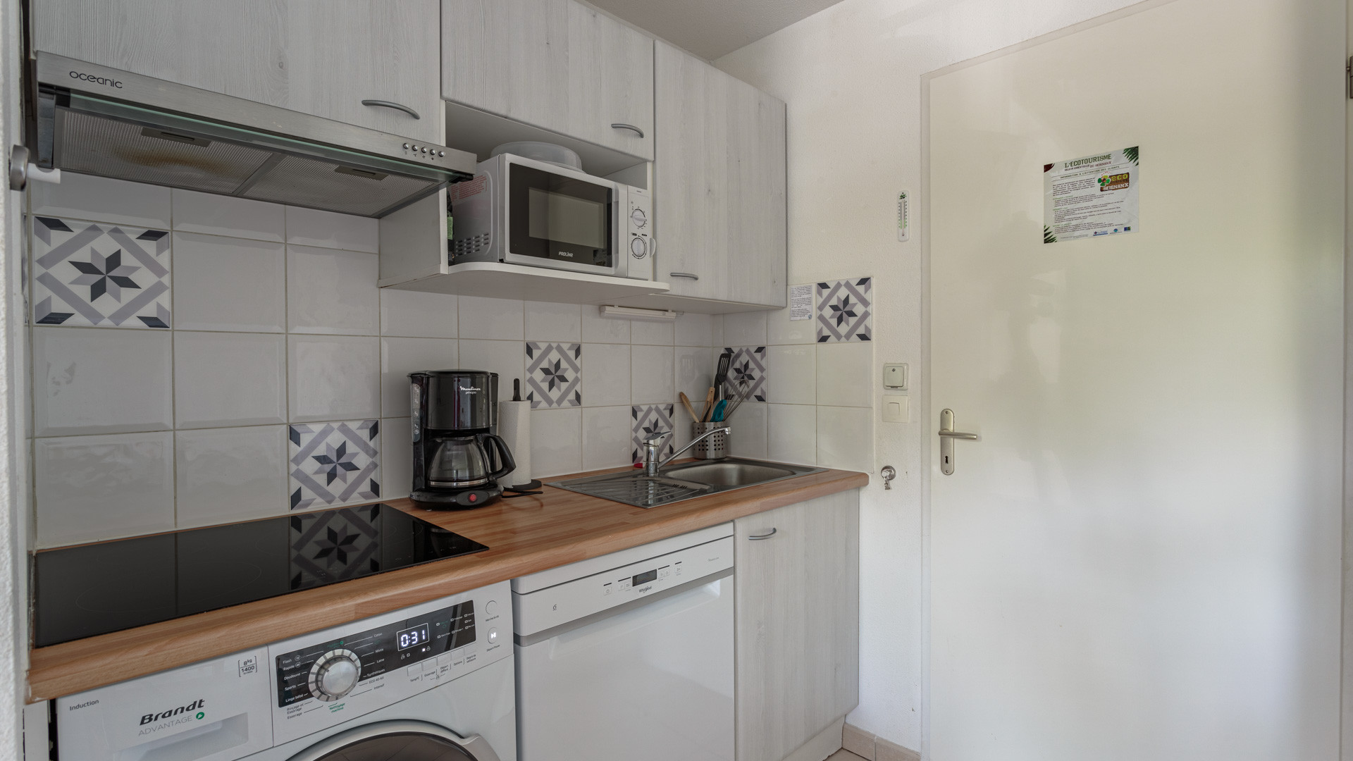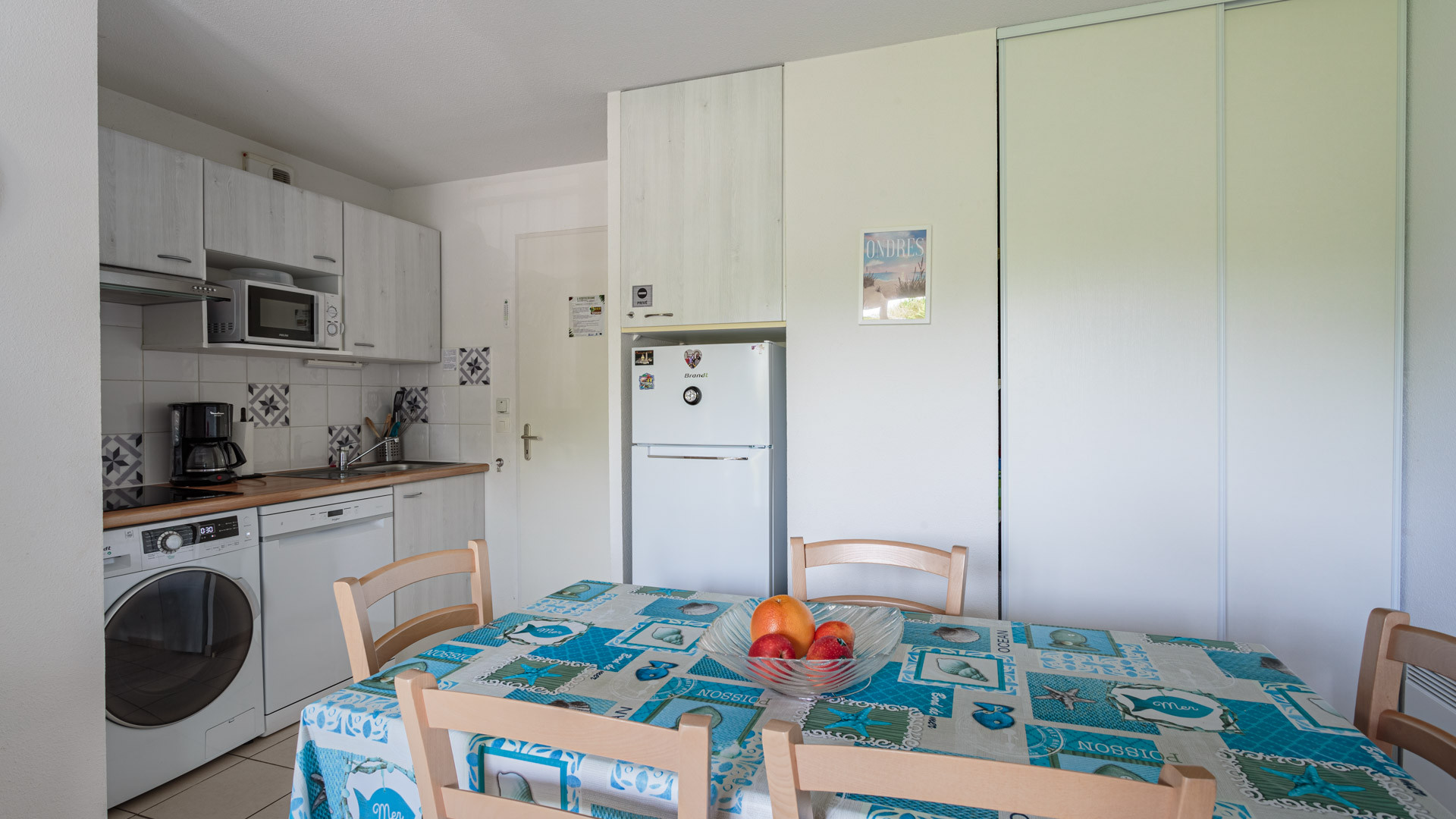 - Cuisine : entièrement équipée avec réfrigérateur, congélateur, micro-ondes, lave-vaisselle, couverts, ustensiles de cuisine, cafetière à filtre, grille-pain et bouilloire.
