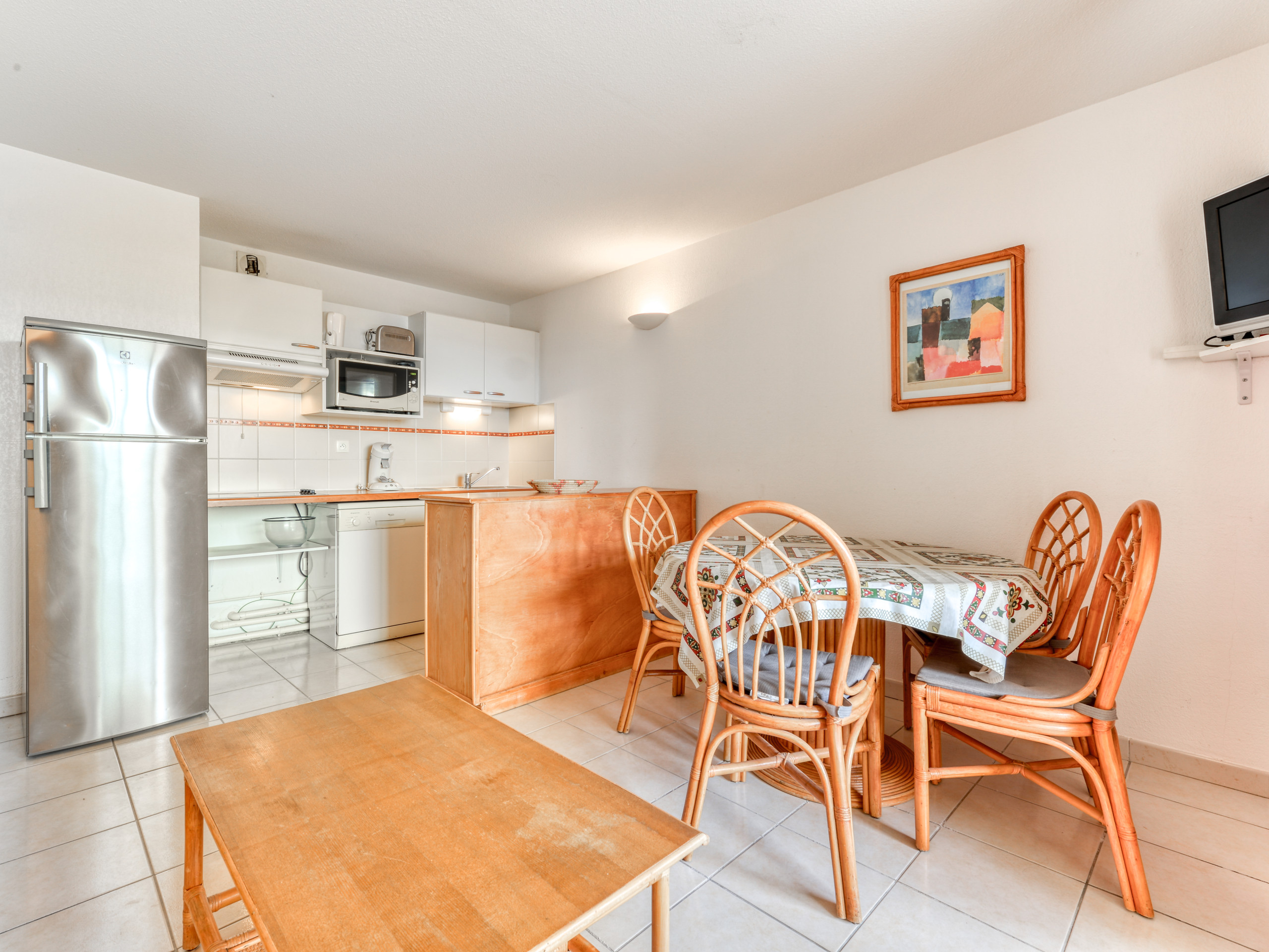 - Cuisine : entièrement équipée avec réfrigérateur, congélateur, mini-four, micro-ondes, lave-vaisselle, vaisselle, couverts, ustensiles de cuisine, cafetière à filtre, grille-pain et bouilloire.