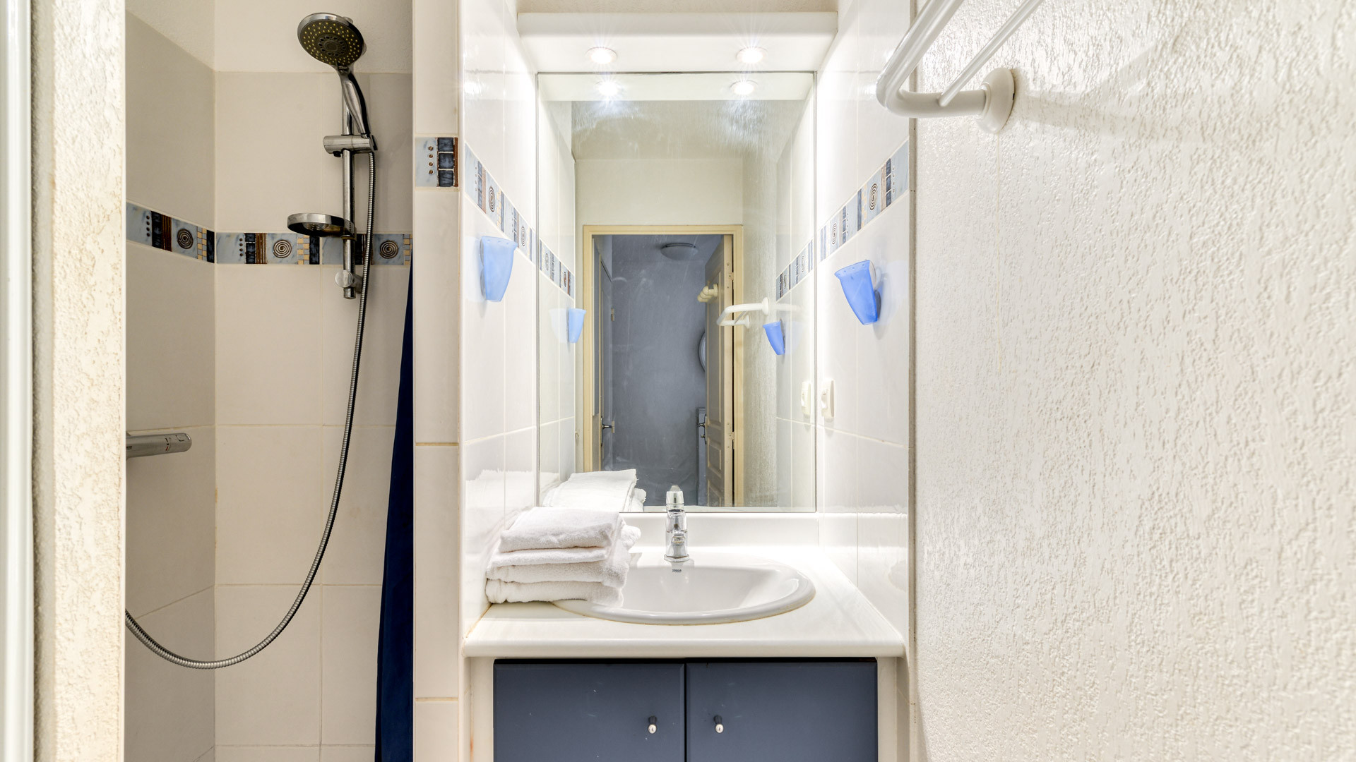 - Salle de bain : douche, porte-serviettes, WC séparés.