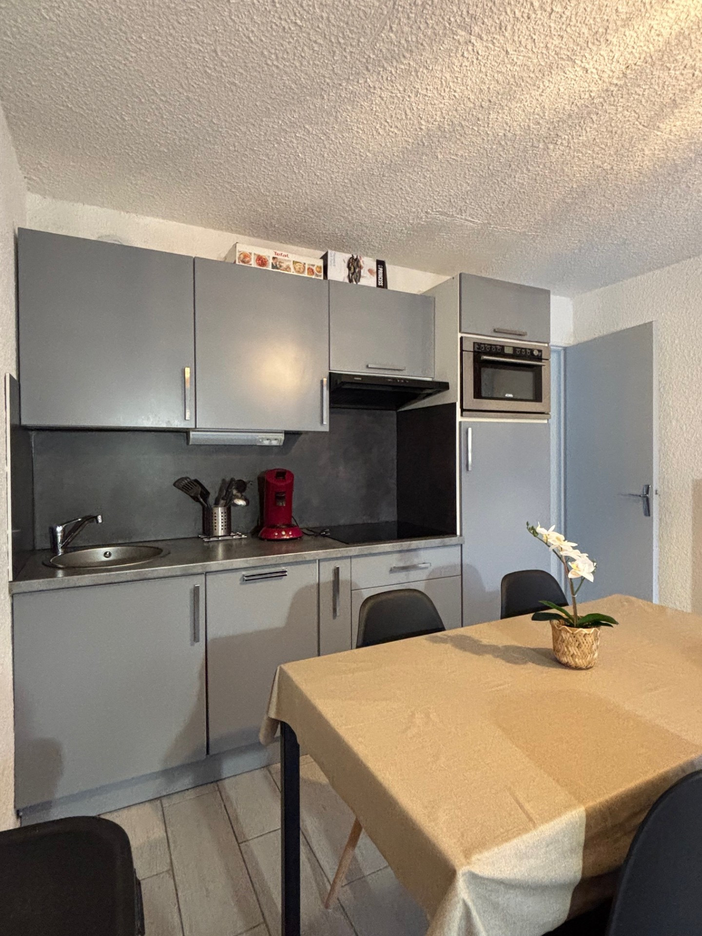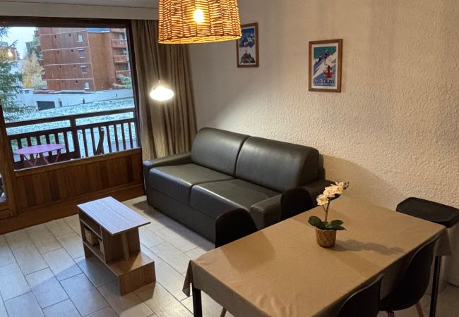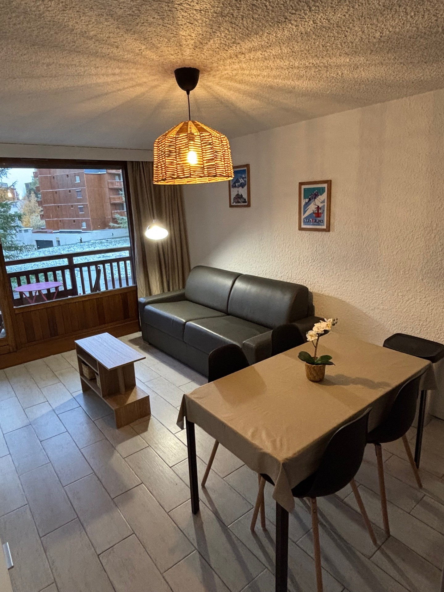 Ce studio de 30m2, prévus pour 4 personnes dispose d'une vue dégagée avec balcon plein sud. Il possède un canapé convertible double et des lits superposés triple dans coin montagne. Il y a un grand téléviseur et un accès WIFi, un petit casier à ski est à disposition.