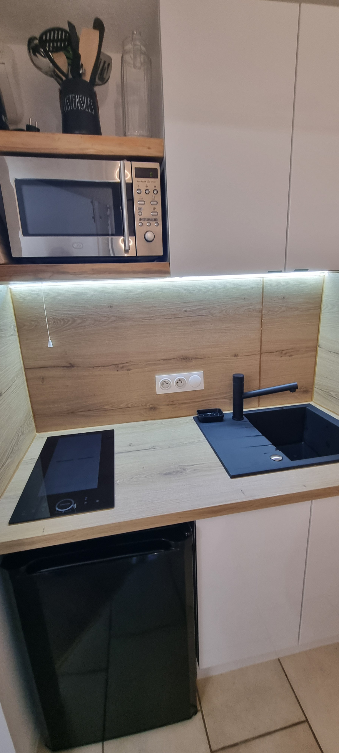- Cuisine équipée (réfrigérateur, micro-ondes, bouilloire, grille-pain, lave-vaisselle, cafetière à filtre, appareil à raclette, vaisselle et ustensiles de cuisine) ;