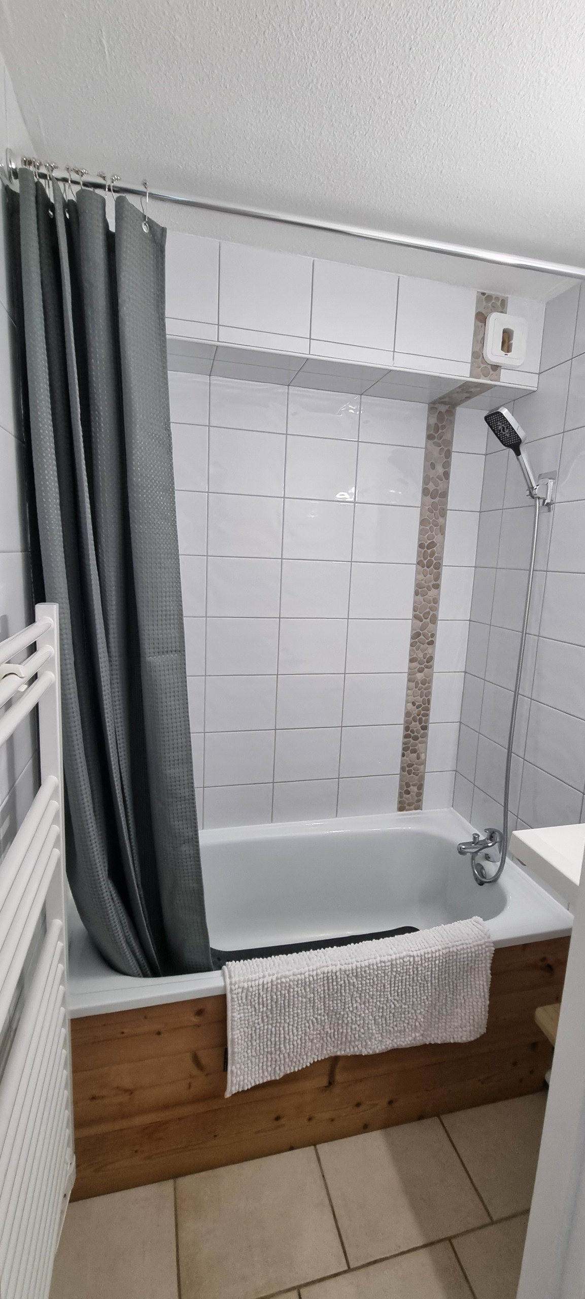- Une salle de bain avec baignoire, porte serviette, sèche serviette et WC;